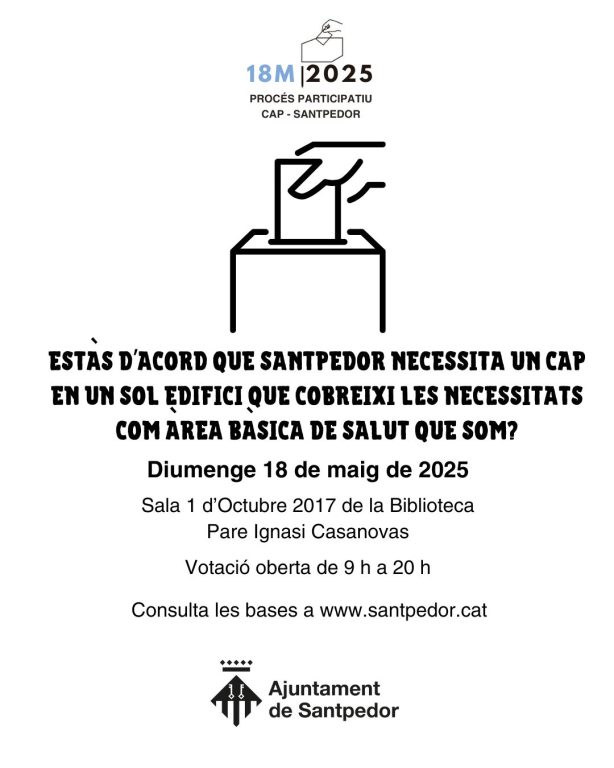 La consulta serà el 18 de maig, de 9 a 20 h del vespre a la Biblioteca municipal Pare Ignasi Casanovas. Podran votar persones majors de 16 anys empadronades a Santpedor a data 19 de febrer de 2025, que coincideix amb la data en què es va anunciar la voluntat de celebrar el procés participatiu.